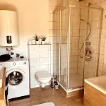 Cette villa de 1 chambres offre une vue sur le jardin depuis les fenêtres. L'établissement comprend une salle de bains avec une baignoire, une toilette séparée et une douche. Un sèche-cheveux et des serviettes sont également disponibles.